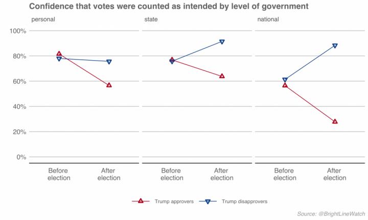 Most notably, confidence in the national vote count plummeted among Trump supporters, declining from 56 percent before the election--to 28 percent afterward.