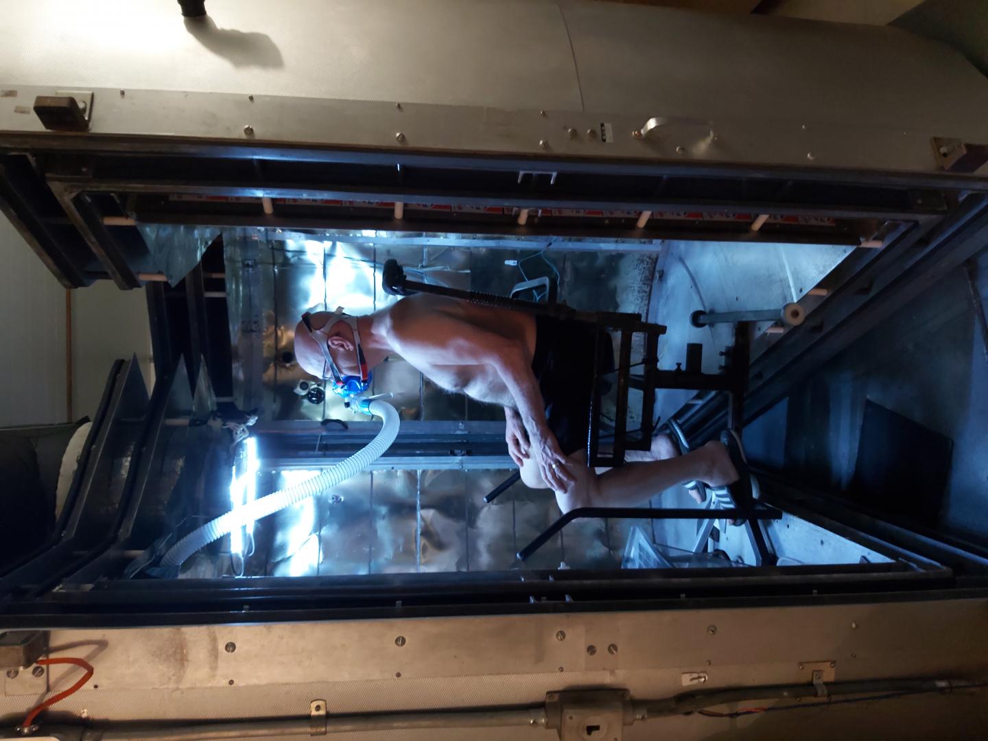 image: A volunteer in the test chamber used for the research. The chamber is heated to simulate a heat wave while devices continually monitor whole-body heat exchange.