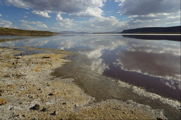 image: Clouds reflecting in lake Magadi, Kenya, located in the Eastern Branch of the East African Rift System. The high rising flanks of the Rift's border faults can be seen in the background.