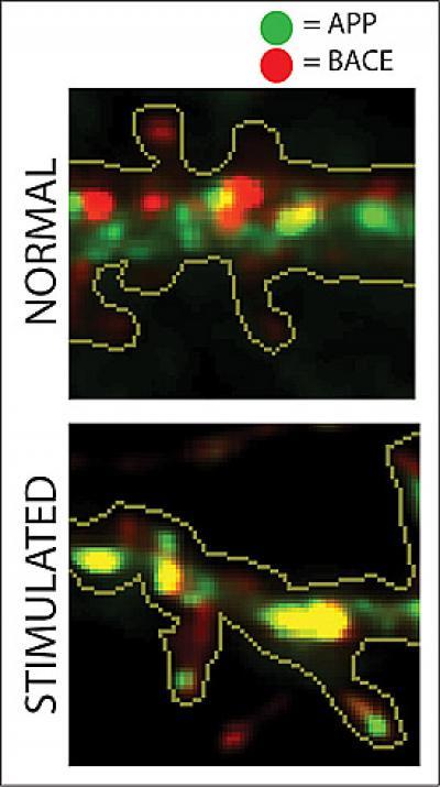Top: Vesicles containing APP (green) and BACE (red) are normally segregated in neurons. Bottom: After neuronal stimulation, known to produce more beta-amyloid, APP and BACE converge in common vesicles, depicted in yellow.