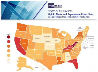 image: The heat map represents opioid abuse and dependence claim lines as a percentage of total medical claim lines by state in 2017 from the FAIR Health private healthcare insurance data repository. The darkest states are those where the percentage is highest. Clicking on a state will display an infographic on opioid abuse and dependence for that state in 2017. The infographic includes the top five procedure codes by utilization and aggregate cost, as well as diagnoses by age and gender.