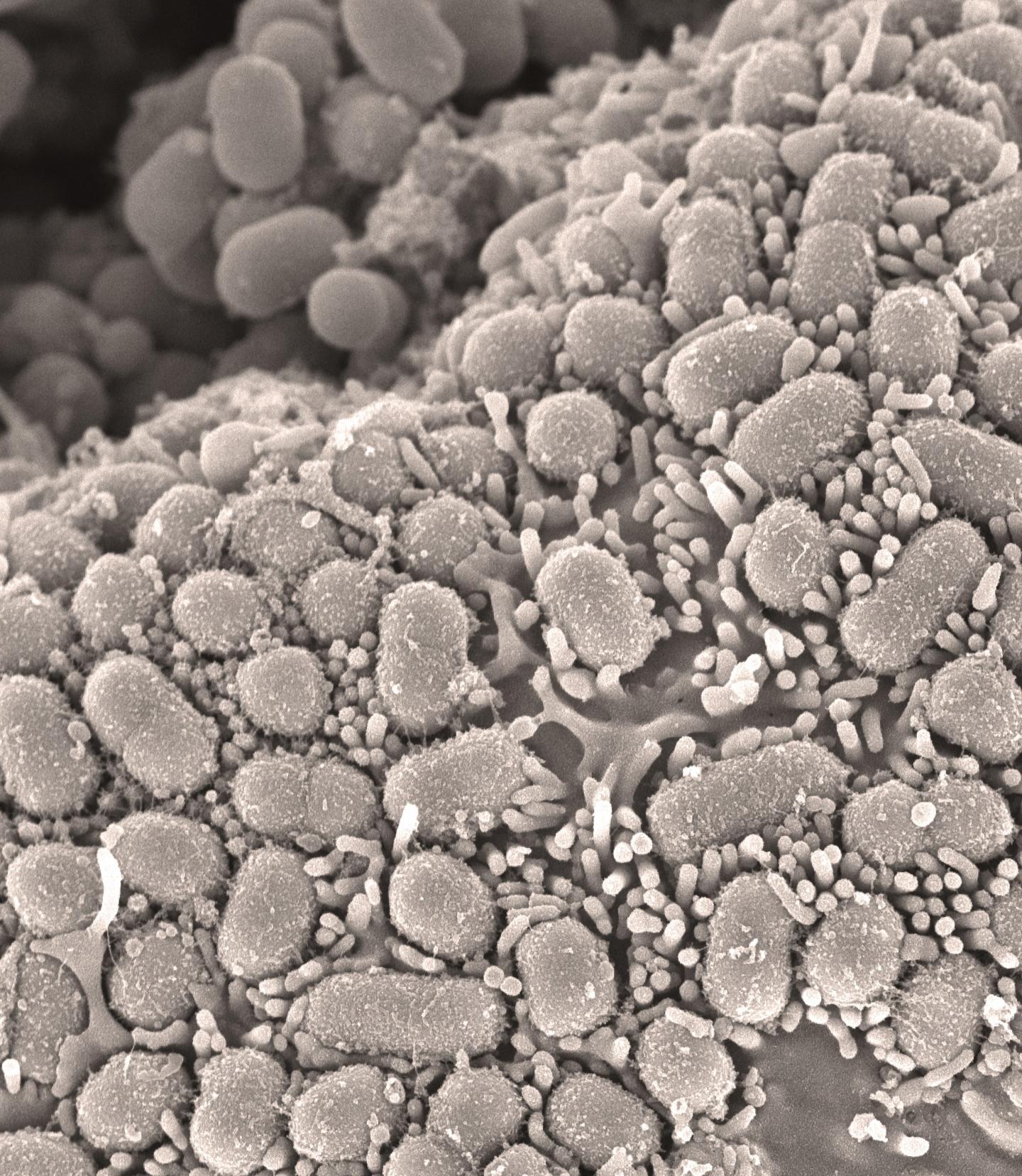 image: Scanning electron micrograph of mouse intestine infected with Staphylococcus aureus.