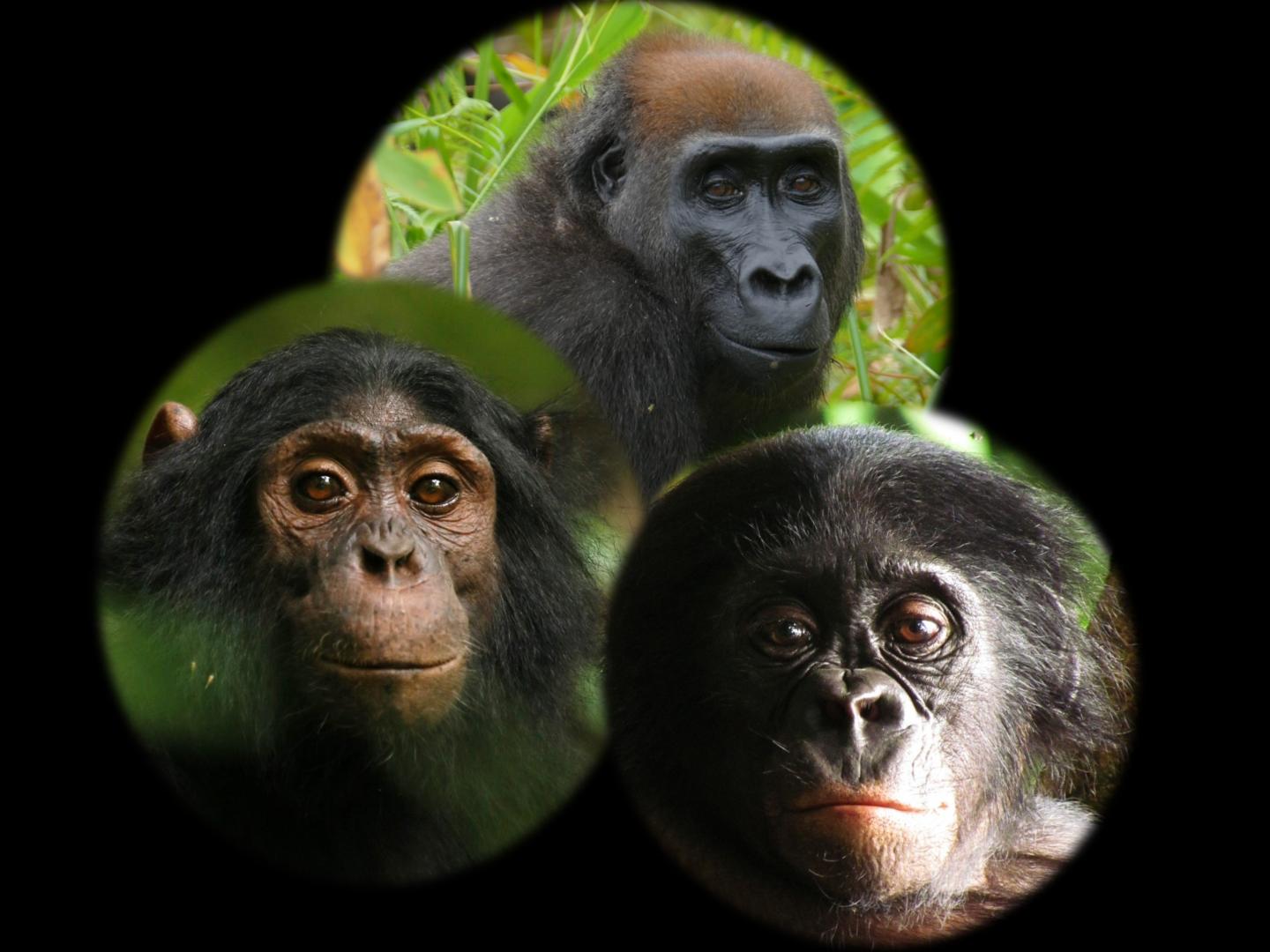image: Chimpanzees (left), gorillas (center) and bonobos (right) notice novel objects in their natural environments, but react to them differently.