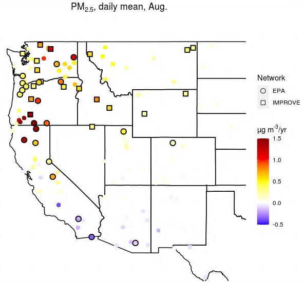 Using air measurements of PM2.5, or the amount of particulate matter in the air with diameters less than 2.5 microns, from the Environmental Protection Agency and the IMPROVE monitoring network, along with measurements of fire area burned and the PM2.5 emitted from those fires, the researchers found consistent trends in air quality that correlated with wildfire activity--but that had different spatial patterns in August than in September.