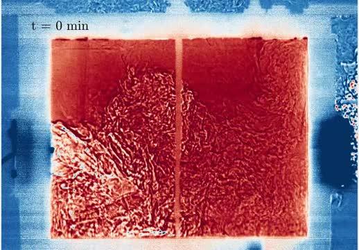 video: False color corresponds to intensity normalized by background intensity. Red corresponds to dyed warm fluid, while blue is undyed cooler ambient fluid. The external flow is from left to right,