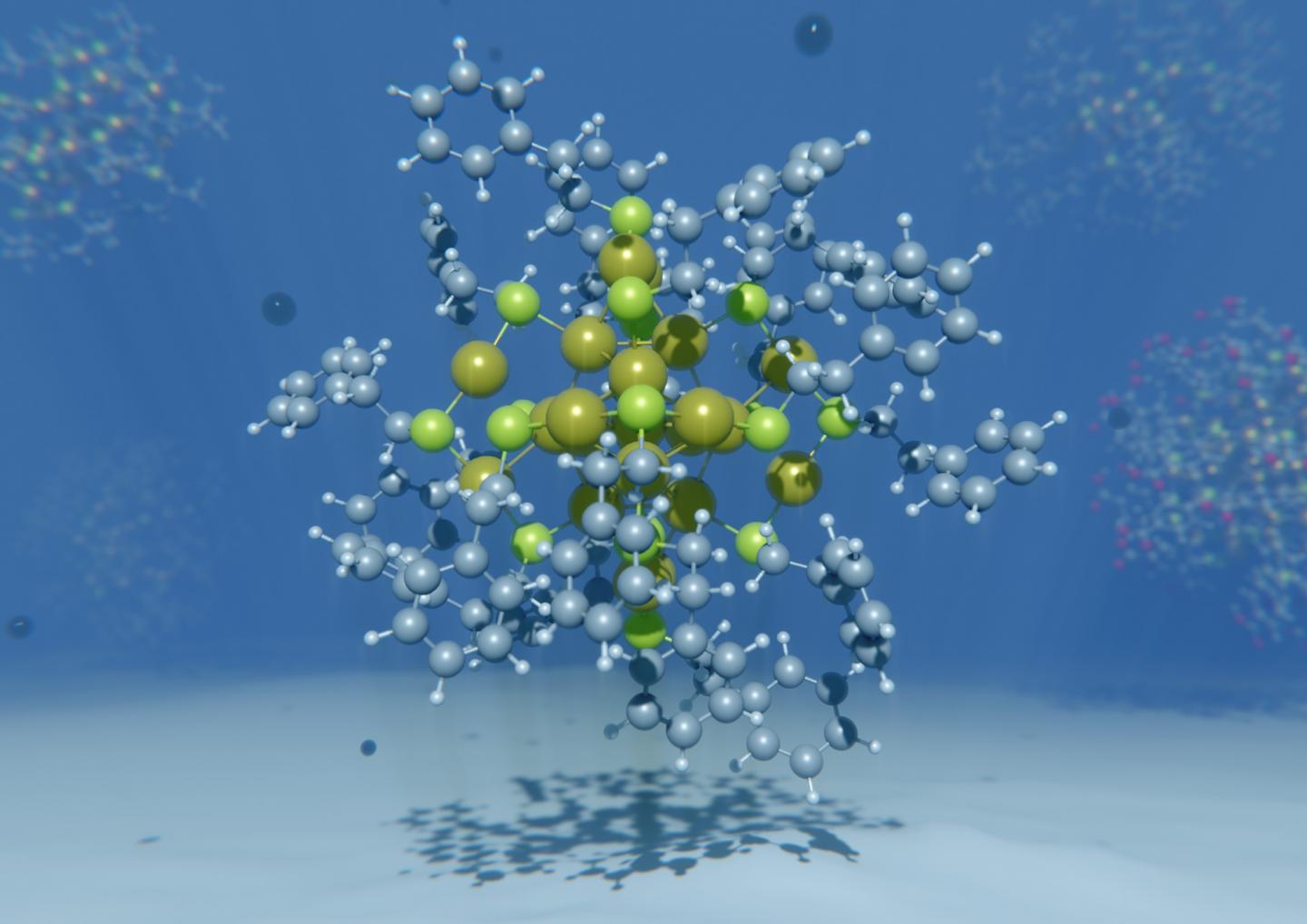 image: Illustration of the University of Pittsburgh's CANELa lab's nanocluster modeling that was featured on the cover of the journal Dalton Transactions. Image reproduced with permission of Mpourmpakis and Cowan.