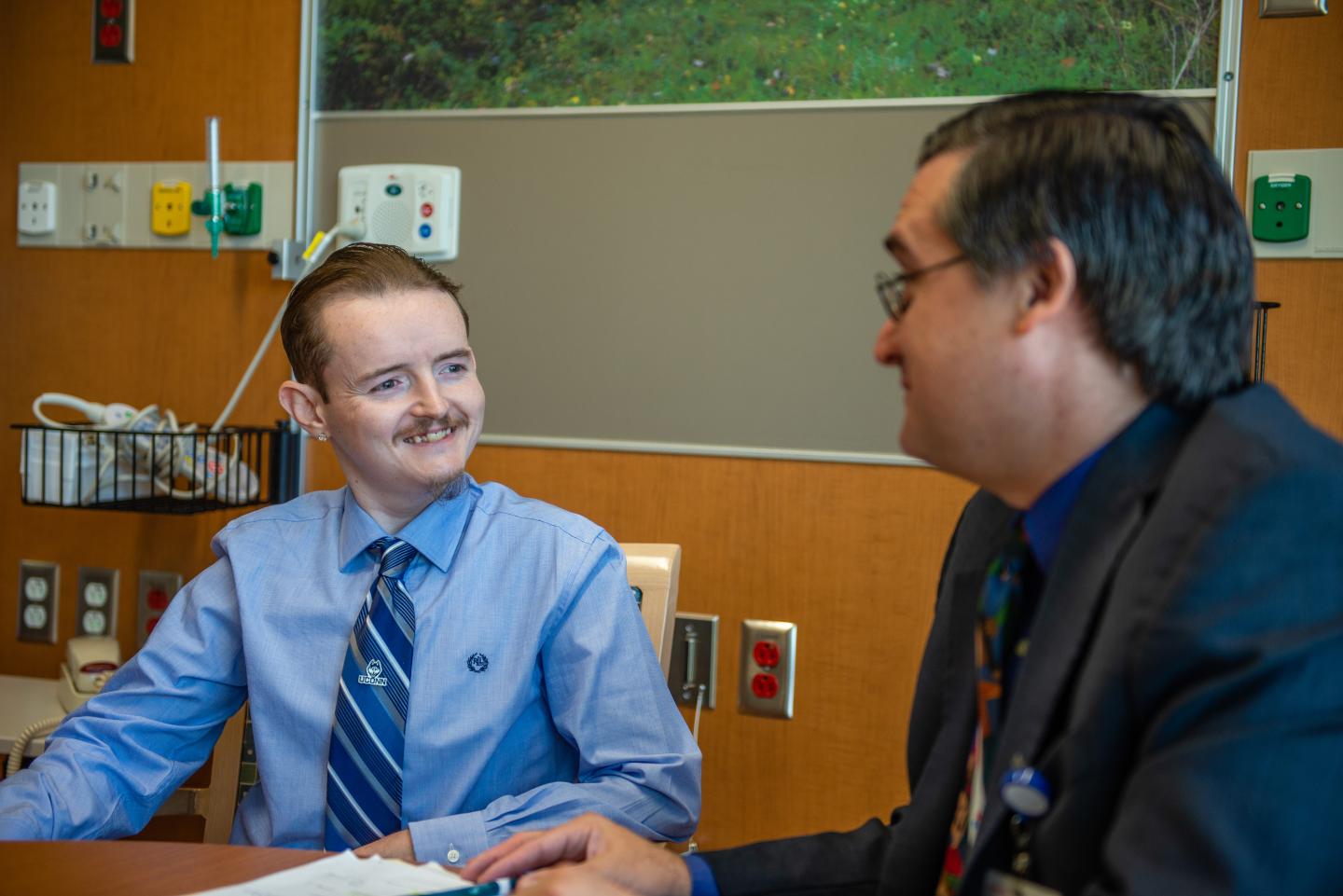 image: Jerrod Watts, a patient enrolled in the first clinical trial for Glycogen Storage Disease, chats with lead investigator Dr. David Weinsten. Photos taken in the dedicated Glycogen Storage Disease Unit at UConn Health.