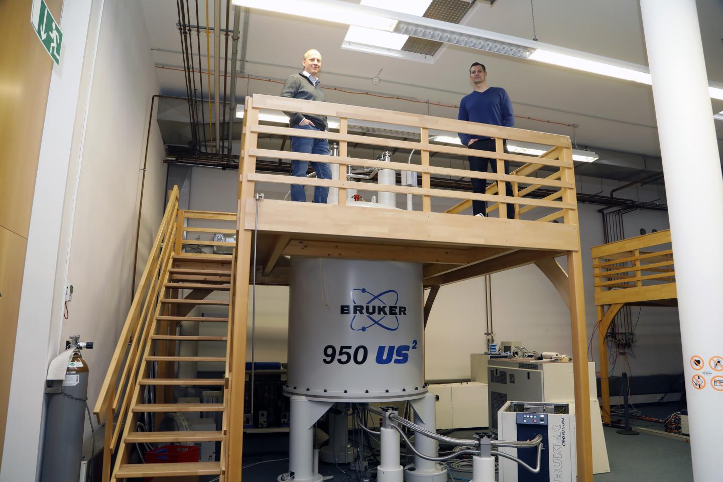 image: Scientists Martin Hengesbach (left) und Andreas Schlundt at the nuclear magnetic resonance (NMR) spectrometre at Goethe-University Frankfurt, Germany.