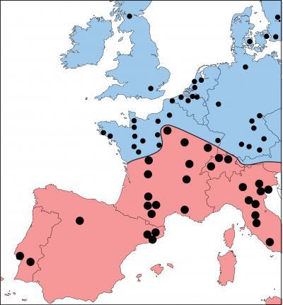 A new technique is the first of its kind to use printed art as a "trace fossil" to precisely date insect species and to identify their geographical locations. Blair Hedges, a professor of biology at Penn State University, developed the technique and used it to examine art printed from woodblocks spanning five centuries. He then identified the species responsible for making the ever-present wormholes in European printed art since the Renaissance. Thismap of Europe shows the locations of cities (black circles) where prints were found to contain printed wormholes of the northern (blue, 1.4 mm holes) and southern (red, 2.3 mm holes) species.