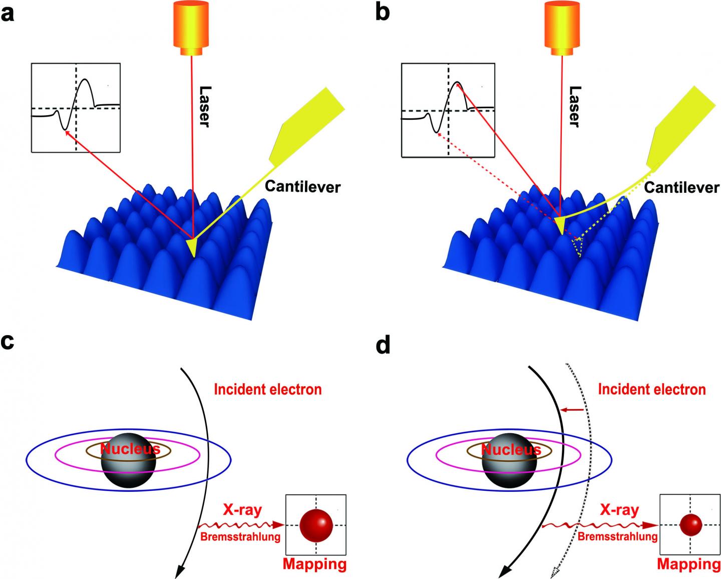 image: Working mechanisms of AFM (a,b) and ANXRI (c,d).
