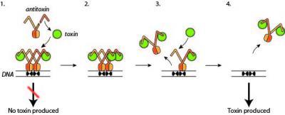 The toxins normally bind very strongly to the antitoxins and are thus not only inactive, but also prevent the production of more toxin from the information encoded in the bacterial DNA. During the dormant state, however, the antitoxins are degraded, and the toxins released (step 1). The free toxins now bind to unoccupied antitoxins on DNA within the area encoding the toxin-antitoxin couple (step 2). Binding increasing amounts of toxin eventually leads to the release of the molecules from the gene (steps 3 and 4) and finally to new toxin production.