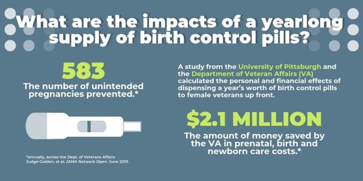 The researchers estimate that among the approximately 24,000 women receiving oral contraceptives from the VA, offering a year's supply of pills would prevent 583 unintended pregnancies and save the VA about $2 million a year in prenatal, birth and newborn care costs.
