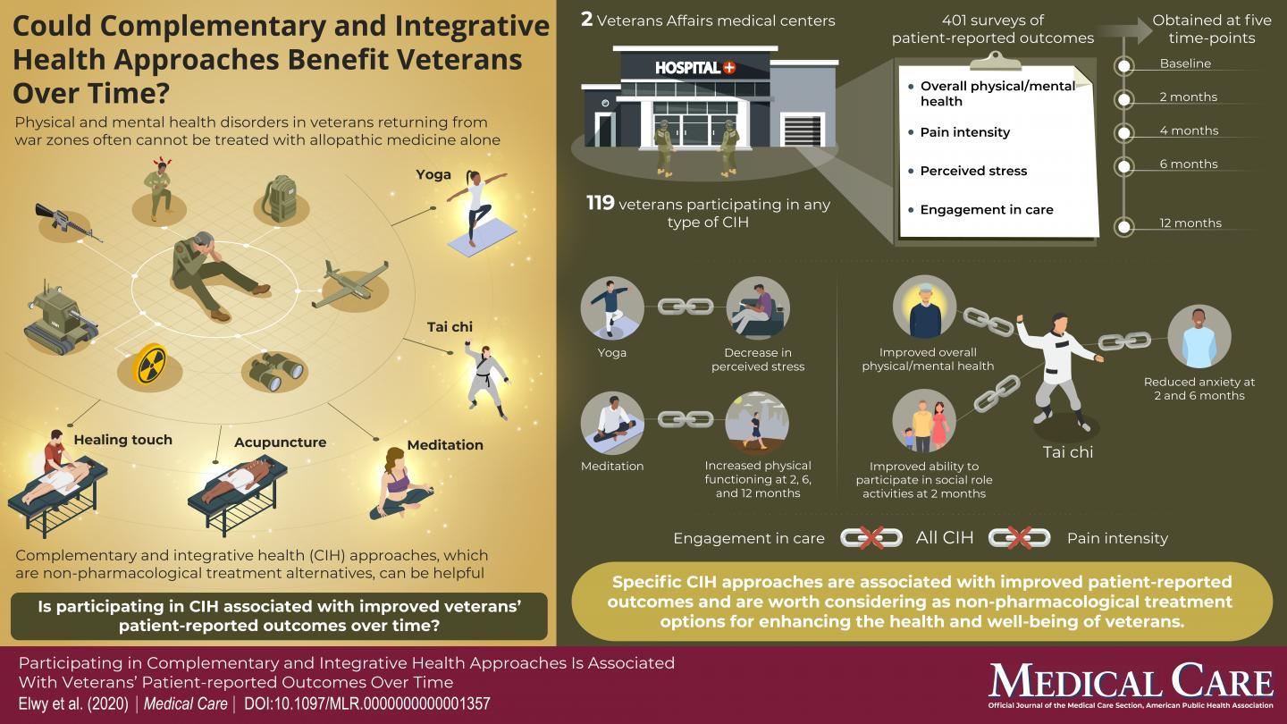 None of the CIH therapies resulted in improvement in Veterans' pain intensity or level of engagement in their health care. Larger studies with longer follow-up times may be needed to show significant effects on these outcomes, according to Dr. Elwy and coauthors. They conclude: "It is time to focus on health and well-being, as defined by Veterans, and reaching these goals must include participation in CIH treatment approaches."