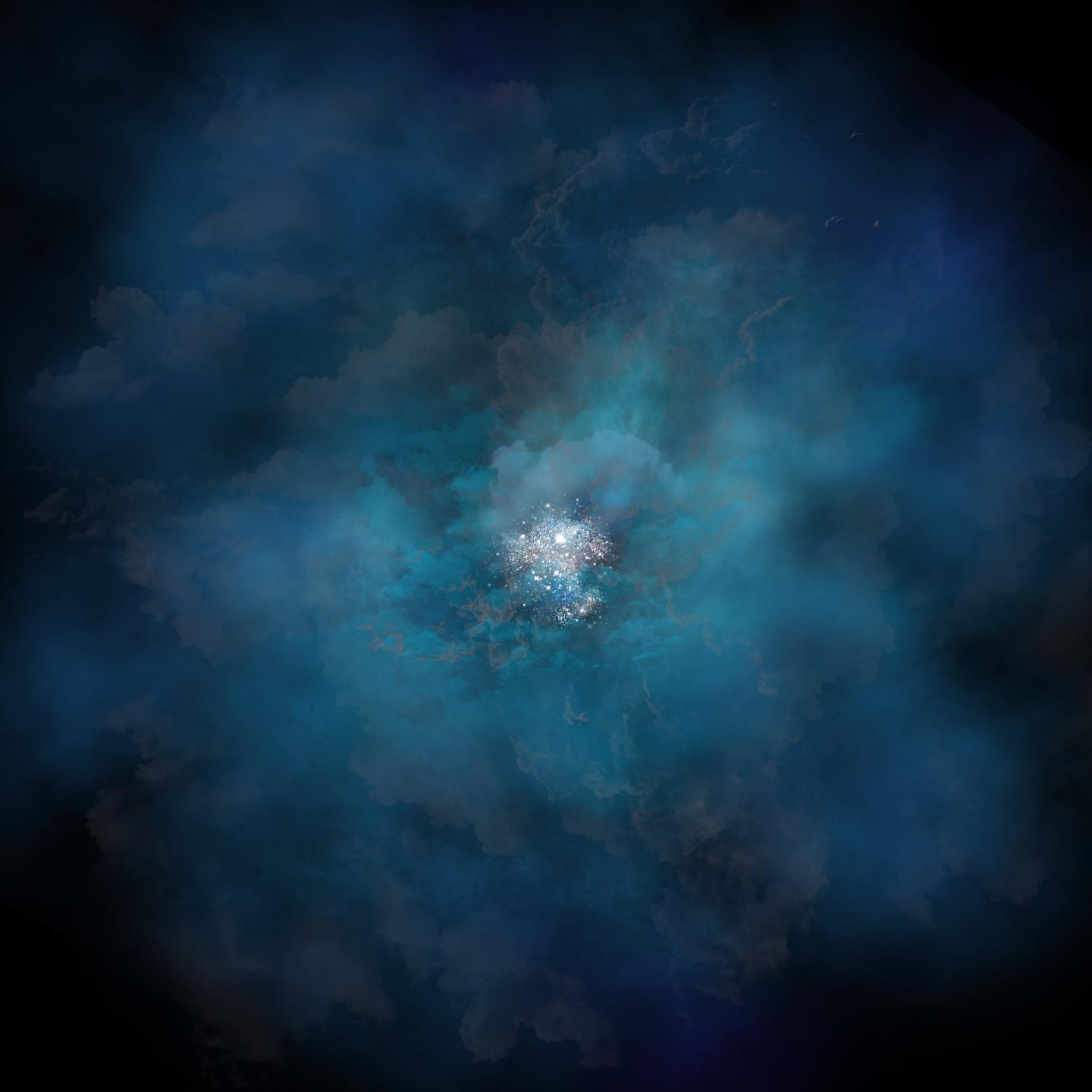 image: This is an artist's concept showing the gaseous halo surrounding a galaxy, illuminated by a narrow band of ultraviolet light called Lyman alpha emission. BX418's gas halo is about ten times the size of the galaxy itself.