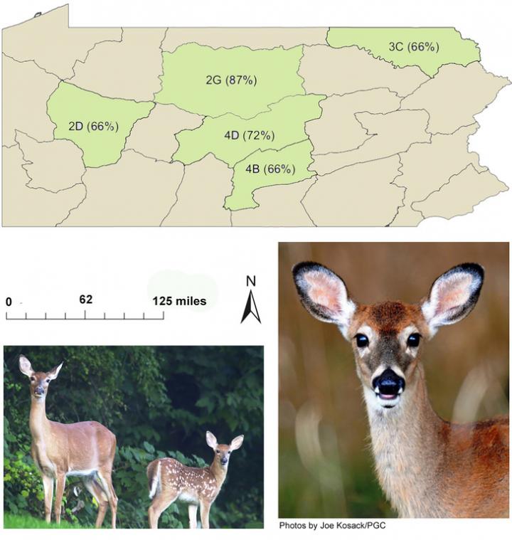 image: This map of wildlife management units in the state of Pennsylvania shows the five areas where deer were captured for this study. Values in parentheses indicate the percentage of forest cover for each unit. Previous research at Penn State revealed that the amount of forest cover on the landscape greatly influenced how far deer that disperse travel.