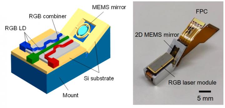 In their latest work, which was presented at the 27th International Display Workshop (IDW '20), they succeeded in creating an optical engine by integrating a compact RGB laser module measuring only 8×4×3 mm with a microelectromechanical (MEMS) mirror. The direction in which the MEMS mirror reflects light from the laser module can be controlled electronically, making it possible to project high-quality 2D images through laser scanning over the projected area.