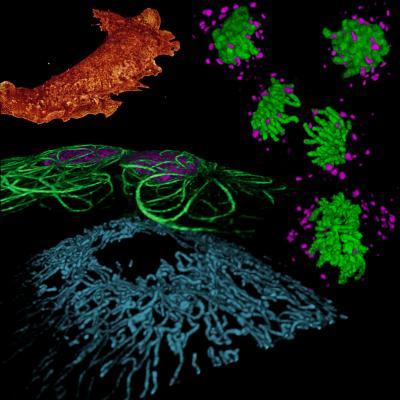 Cellular structures are seen by Bessel beam plane illumination microscopy. Clockwise from upper left: membrane ruffles in a monkey kidney cell; chromosomes (green) and golgi (magenta) in a dividing pig kidney cell; mitochondria in a living pig kidney cell; and microtubules (green) and nuclei (magenta) in a pair of human osteosarcoma cells.