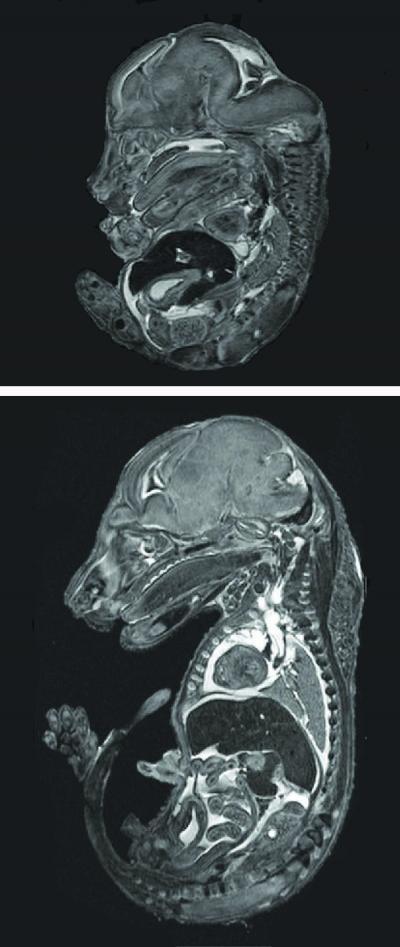 Magnetic resonance images of two mouse fetuses -- the top is a smaller, malformed one from a zinc-deficient mouse; the bottom is a healthy fetus from a mouse in the control group.