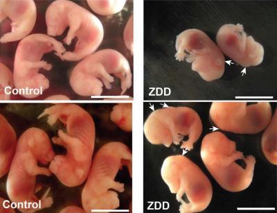 Going without zinc prior to ovulation had marked effects on the mice's reproductive functions. Zinc deficiency caused a high incidence of pregnancy loss, and embryos from the zinc-deficient diet group were an average of 38 percent smaller than those from the control group. Preconception zinc deficiency also caused approximately half of embryos to exhibit delayed or aberrant development.